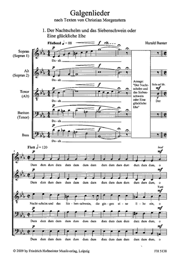 Performable by chamber choirs or vocal ensembles in the line-up SATBarB or SSATB. The poems are taken from the collection "Galgenlieder" by the German poet Christian Morgenstern.
